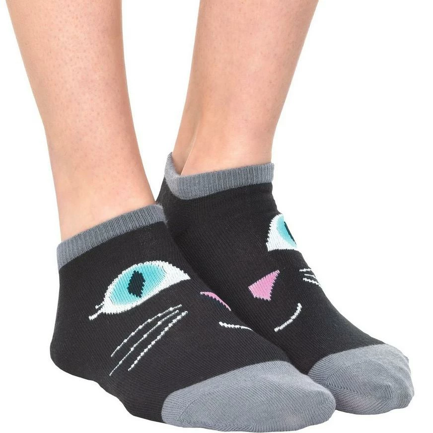 Pussyfoot your way to the best treats in Adult Black Cat Ankle Socks . These black socks feature grey trim at the toes and ankles with half of a black cat face printed at each instep. Slip socks on before donning cloven hooves or witch’s boots to keep your feet nice and warm for Halloween.
