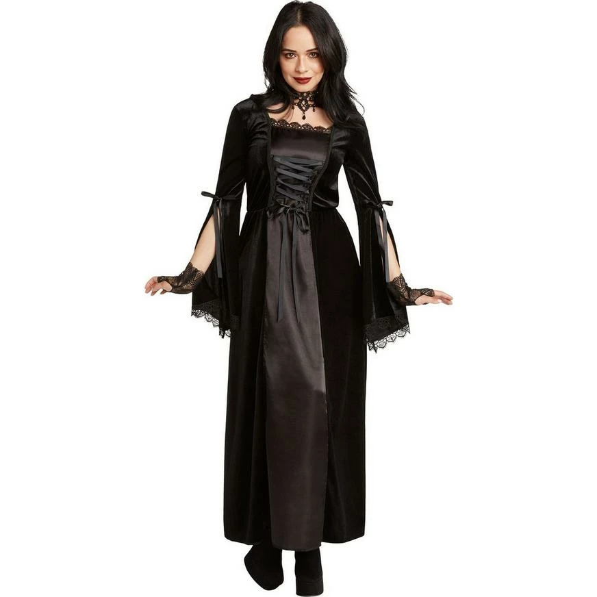 Whether you’re a fair maiden or a wicked witch, show up to the Renaissance faire with the most elegant look in a black dress for adults! The crushed velvet dress features sleeves slit at the elbows, lacing on the bodice, and a satiny center panel. Complete your medieval look with this elegant gown!