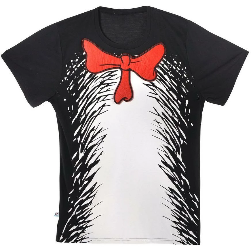 Complete your Cat in the Hat costume with a Dr. Seuss Cat in the Hat T-Shirt! This black shirt features a printed design of the cat’s fur with a red felt bow attached below the collar. You can dress up as the beloved Dr. Seuss character this Halloween with this awesome shirt!