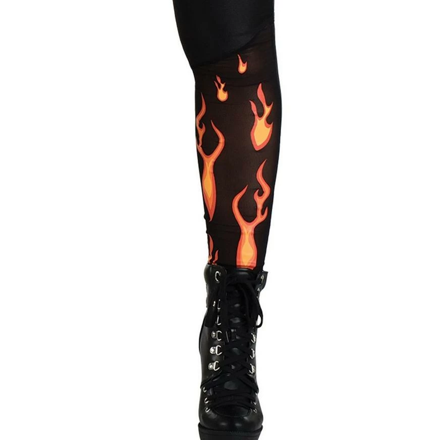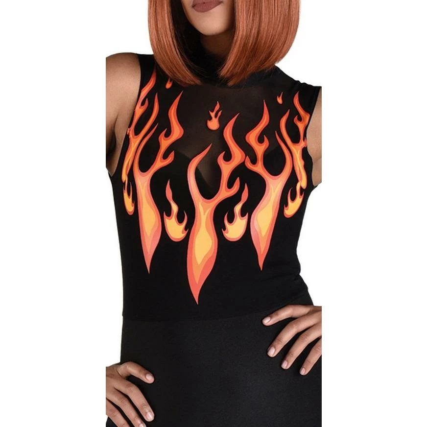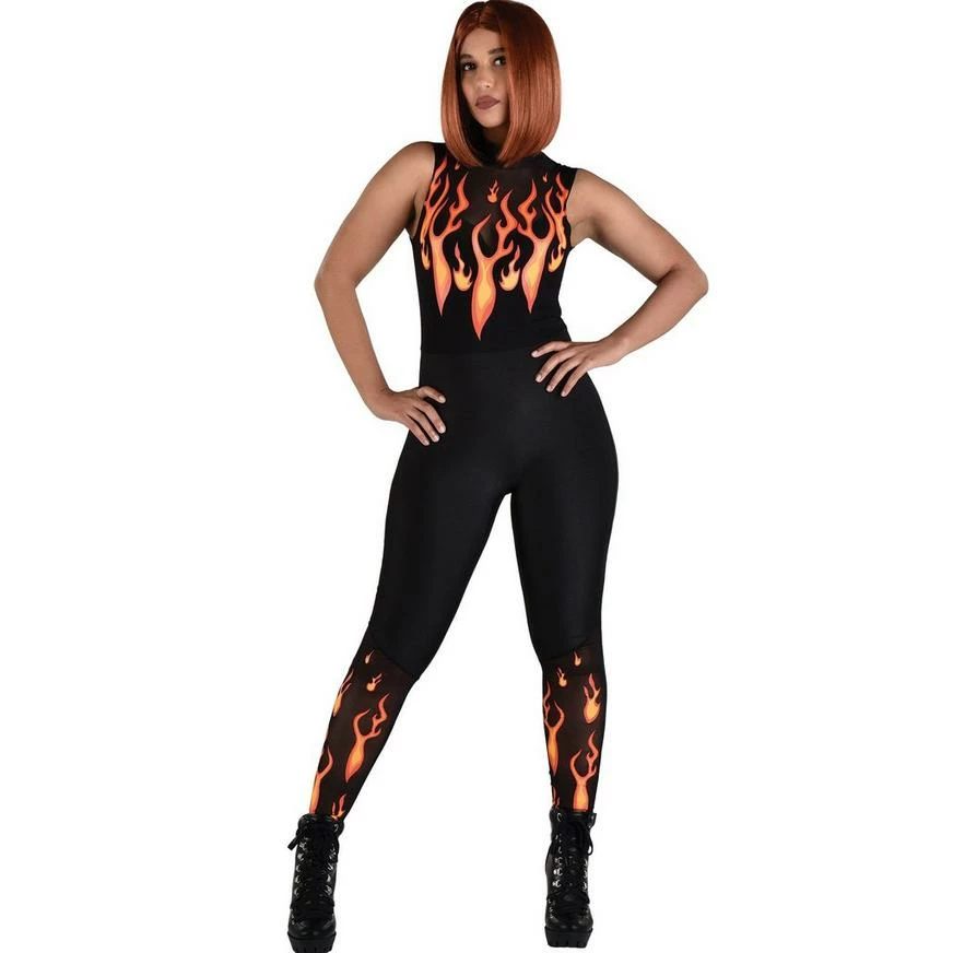 Turn up the heat this Halloween in the Flaming Devil catsuit! Made of 100% polyester, this catsuit is black with forking flames on the chest and legs. It’s the perfect base to your devil costume.