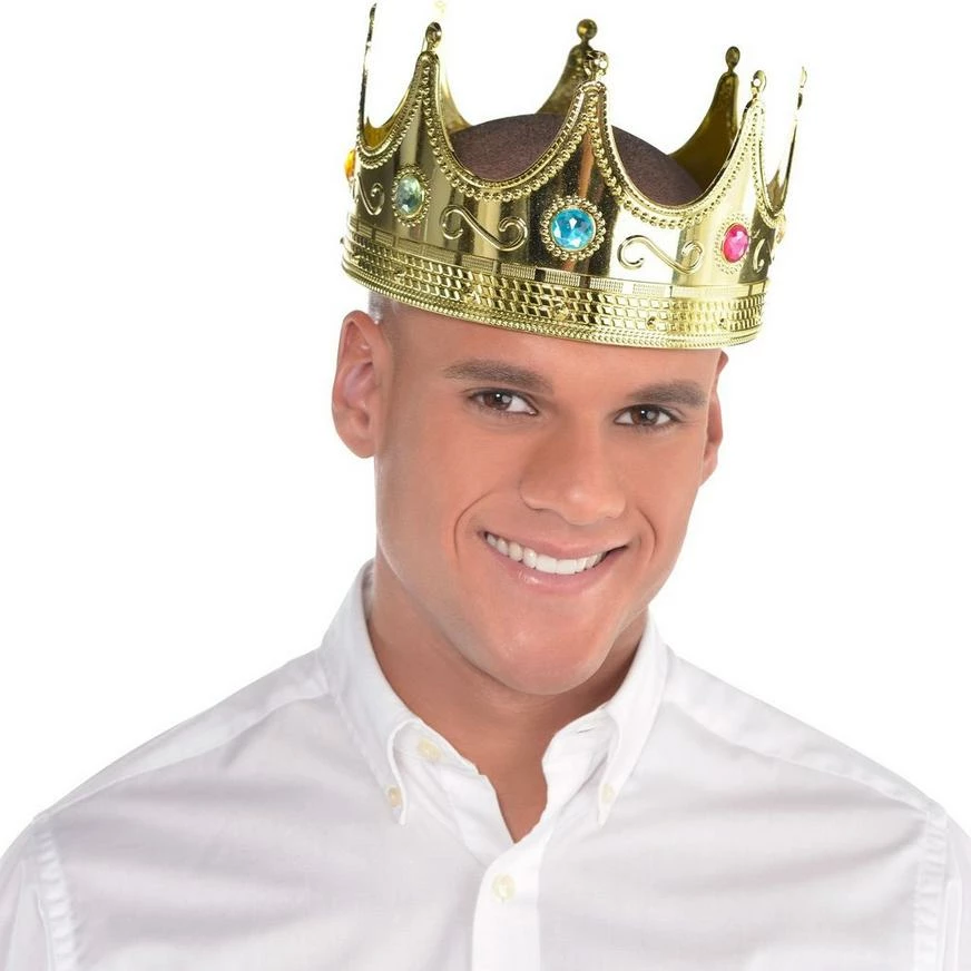 Make way for the king! This Jeweled King Crown features eight regal points in molded gold plastic, raised ornamental details, and faux jewel embellishments fitting for the head of state. A foam lining keeps the crown resting comfortably and sitting tight for your coronation. Such an air of command! Now if only the queen would listen …