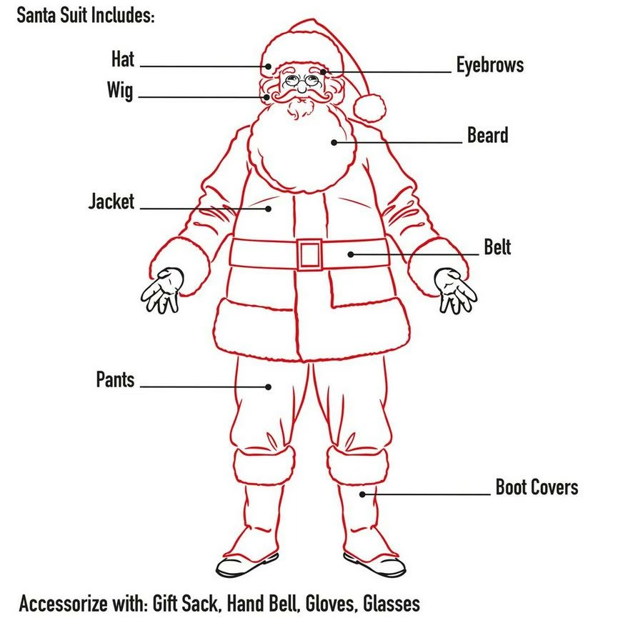 Play Santa in satin this Christmas! This plush red Santa Suit features a satin-lined, zip-front Santa jacket with plush faux fur trim and matching pants with pockets. This classic Santa costume suit comes fully accessorized with a Santa hat, beard, wig, eyebrows, faux-leather belt with buckle, and black faux-leather boot covers.