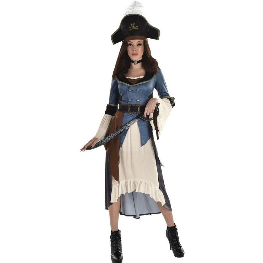 Make the other swashbucklers jealous as the Posh Pirate! A more elegant pirate style, this costume features a peplum-style dress with an attached blue suede jacket and a black faux belt with an antique-looking brass buckle. Completing the costume are a black velour choker and a black suede bicorn hat with a gold skull-and-crossbones.