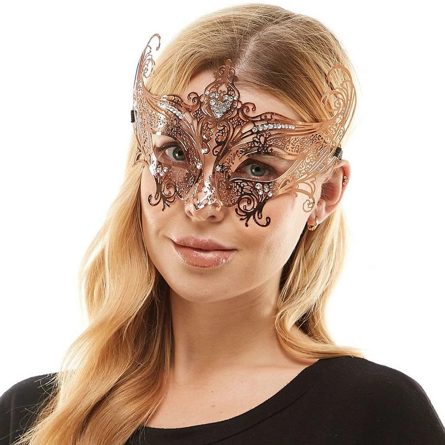 Perfect for a masquerade ball, or any costume requiring an elaborate mask, this detailed half-mask is made of rose gold stainless steel and wraps intricately around your eyes and face. It is studded with rhinestones that really bring this piece over the top.