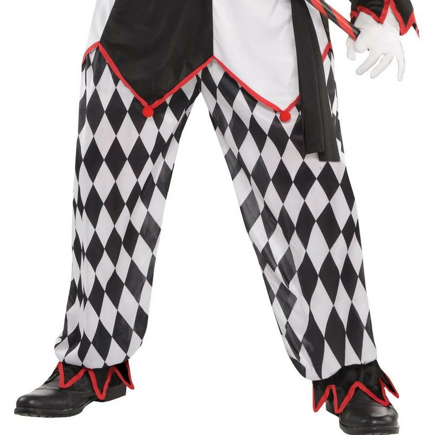 More on Adult Sinister Jester Costume Plus Size: You’ll scare everyone in the royal court wearing a Sinister Jester Costume Plus Size for men. This plus-size jester costume features a mask with red eyes to match the bells hanging off the jester hat. The black and white harlequin-print tunic features blood red trim and pom-poms. A bone ribcage is printed on the front of the tunic for a scary effect. The matching pants have an elastic waistband for added comfort as you torment spectators or trick-or-treaters. Tie your look together with the included black sash and cause laughs or screams on Halloween night. Review the size chart for additional sizing information. Shoes, cane, and gloves not included.