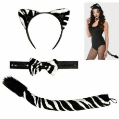 You’ll make even lions purr in this saucy zebra ensemble. The costume kit includes a headband with zebra ears attached, a zebra stripe bow tie choker, and a zebra tail with a faux fur tip.