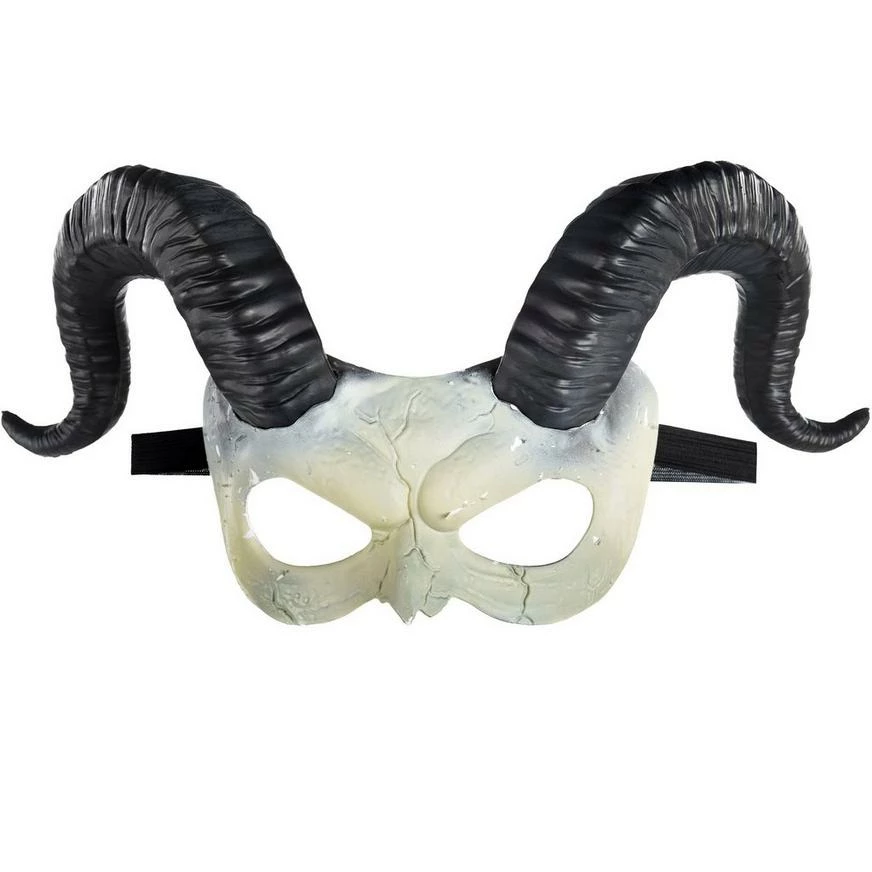 This ram half mask features a pair of curled horns, molded contours, and a furrowed brow. It’s painted white with cracked details, giving it a worn look.