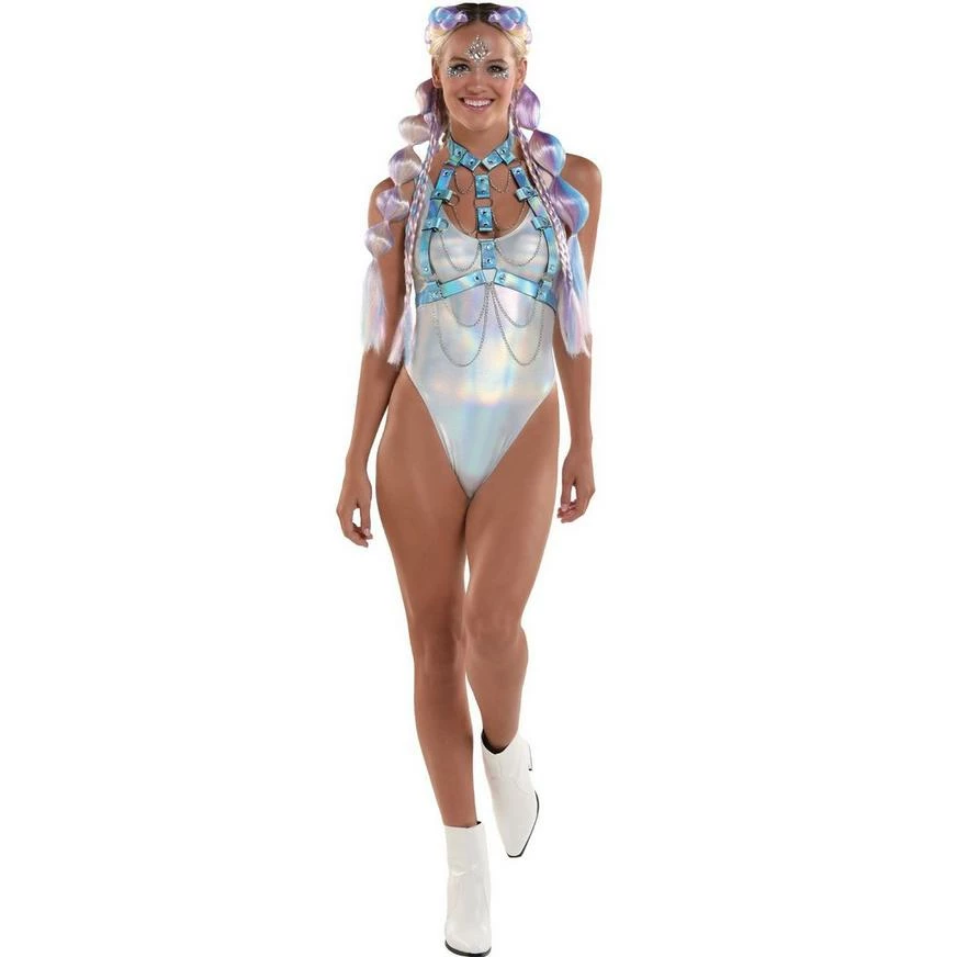 Get playful with your festival fit by strapping on this blue chest harness! It features a fun shape, layers of chains, and a beautiful iridescent finish.