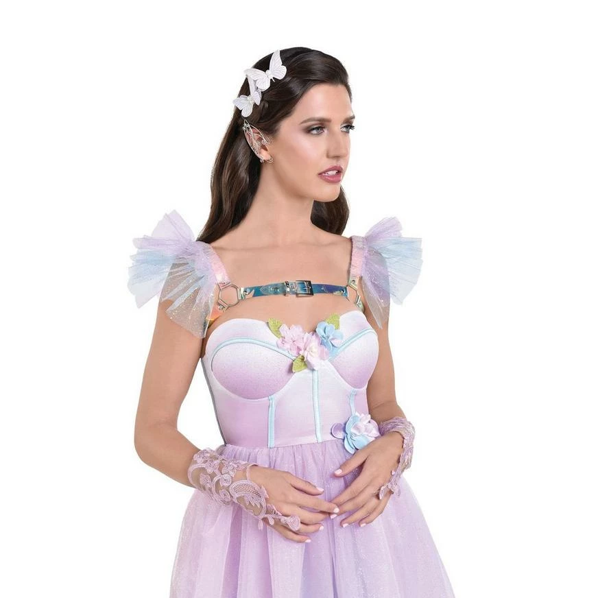 Take your fairy outfit to the next level by layering on this body harness! It features lavender and blue tulle shoulders, silver hardware, and a beautiful iridescent finish.