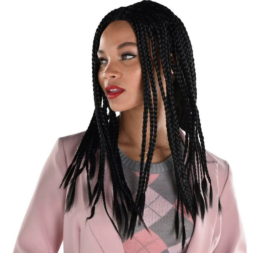 “Get the iconic 90s look with this box braid wig. The thin braids are parted down the middle, tied off with elastic, and reach just about chest-length.