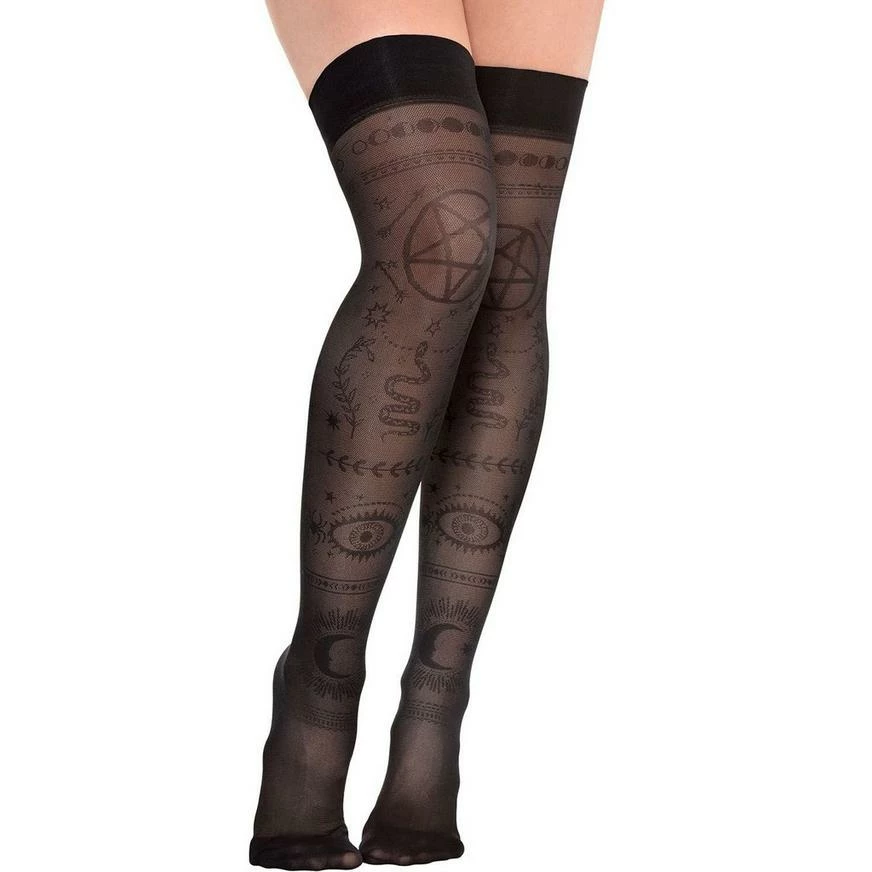 Spice up your mystic or psychic costume with Celestial Socks! These high socks are made of black sheer fabric and feature a design of mystical motifs, like the all-seeing eye, moons, and pentagrams.