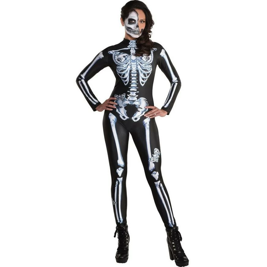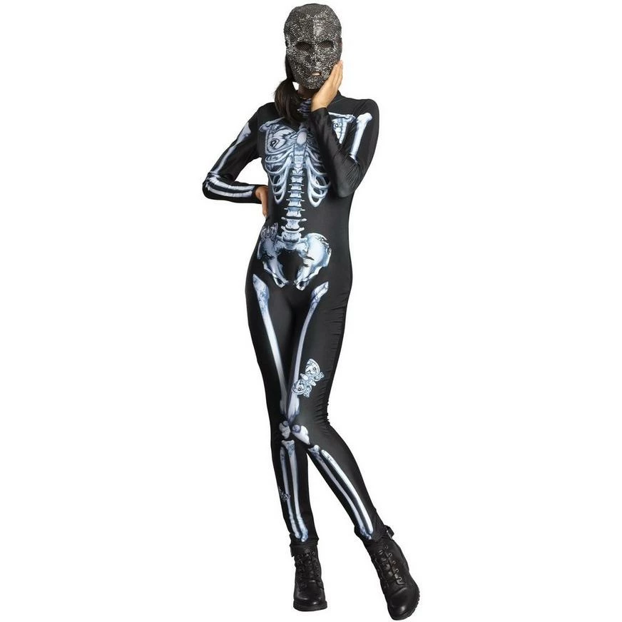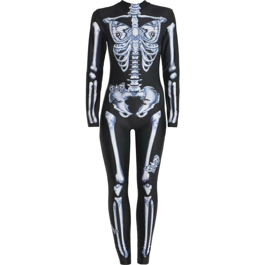 This black long sleeved catsuit features a classic printed skeleton design with a butterfly twist. The form-fitting costume is stretchy for comfort and gets you suited up for Halloween in no time at all.