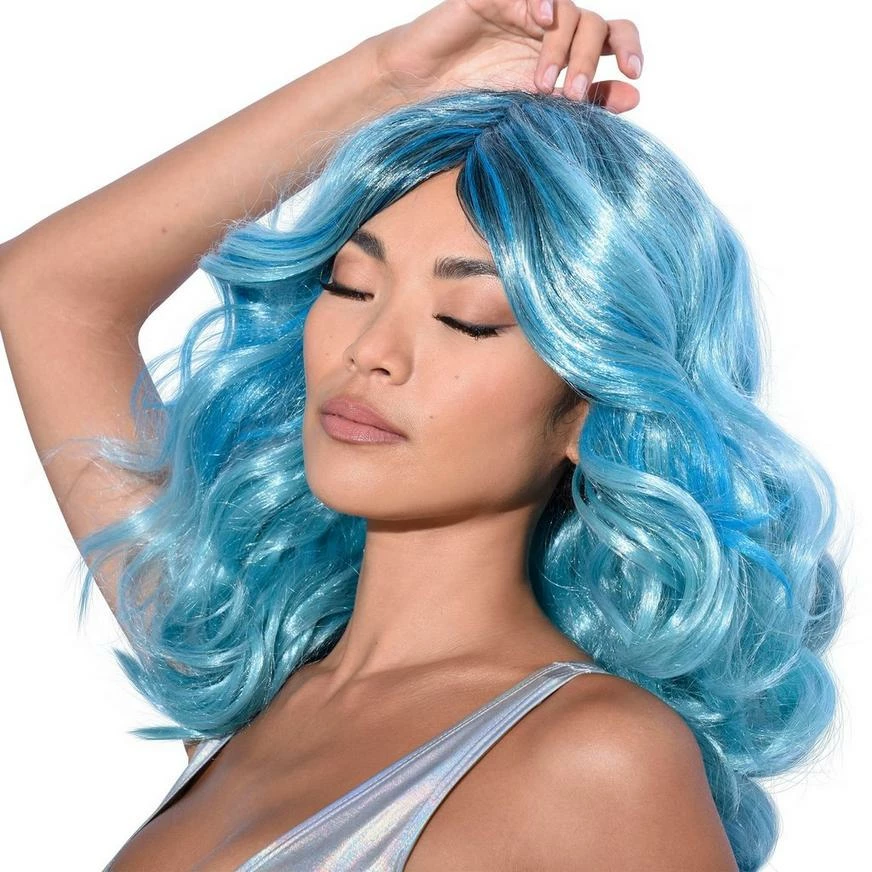“Perfect your Halloween or cosplay look with this vibrant wig. The medium-length synthetic hairs are parted down the center and styled into voluminous curls.