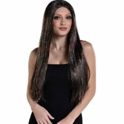 “Perfect your Halloween or cosplay look with this brunette wig. The long synthetic hairs are parted down the center and highlighted with colorful, shining tinsel.