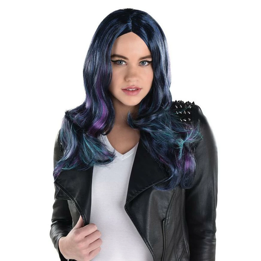 “Perfect your Halloween or cosplay look with this oil slick wig. The medium-length synthetic hairs are parted down the center, highlighted with purple and turquoise streaks, and styled into loose curls.
