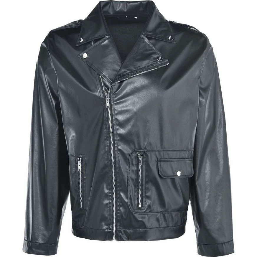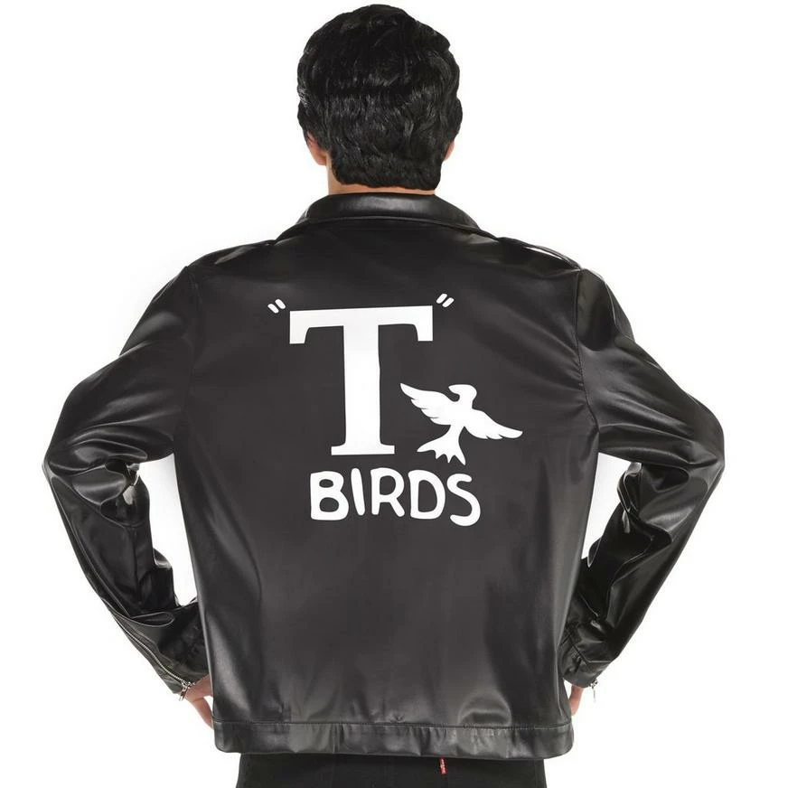 Get ready to hang out with the rest of the greaser gang at Rydell High School in a Grease T-Birds Leather Jacket! The black leather jacket features a white T-Birds logo on the back. Wear this jacket with jeans a T-shirt and boots (sold separately) to create your own greaser costume. Meet the rest of the T-Birds at the Frosty Palace in a T-Birds Leather Jacket! Review the size chart for additional sizing information. Shoes wig shirt and pants not included. Grease T-Birds Leather Jacket product details: Foam and polyester Hand wash cold line dry Officially licensed Grease product.