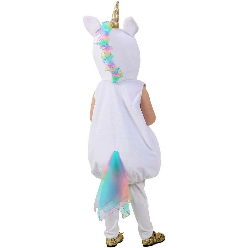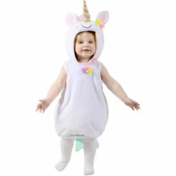 More on Baby Pastel Unicorn Costume: Show off how unique your little one is in this Pastel Unicorn Costume for babies! The one-piece, hooded jumpsuit features a tulle mane and tail in a rainbow of pastel colors, a unicorn face right on the hood, and flower details to bring it all together. This super simple Halloween costume can also serve as a no-fuss unicorn party outfit! Review the size chart for additional information. Tights not included.