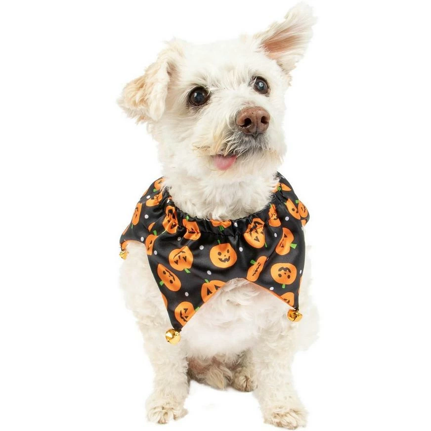 Your doggie deserves to go trick-or-treating too! And now they can, wearing this paw-some dog scrunchie around their neck. The costume accessory is black with orange lining, cut in a harlequin collar design, features a scattered jack-o’-lantern design, and has jangly little bells attached to the ends.