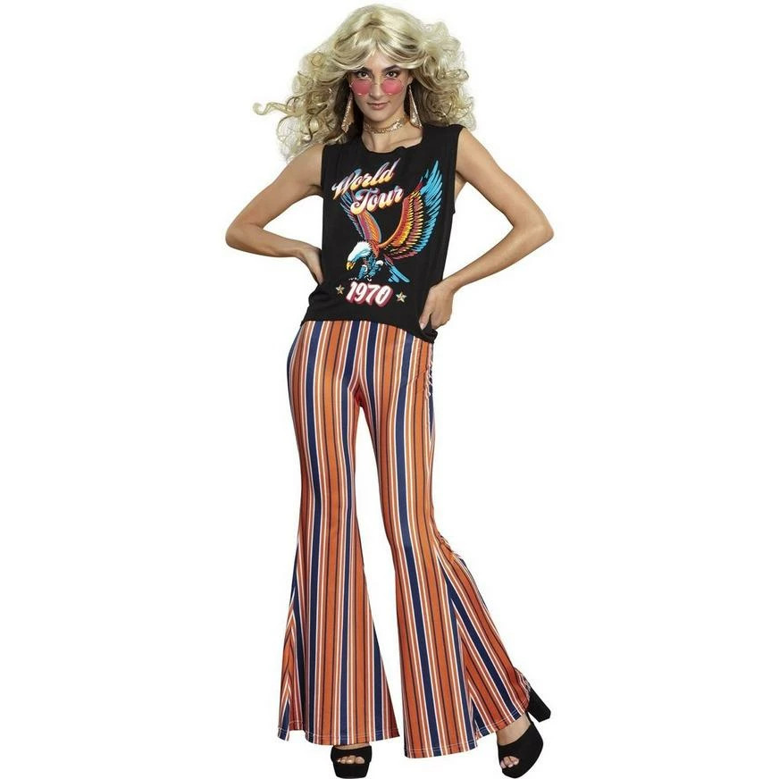 These classic bell bottom trousers are fitted through the waist and thigh and have that iconic flare starting at the knee. Its vibrant blue and orange stripes will have you standing out on any dance floor you step foot on.