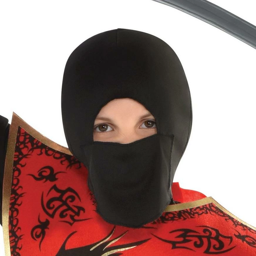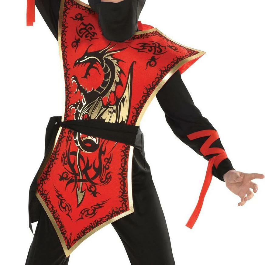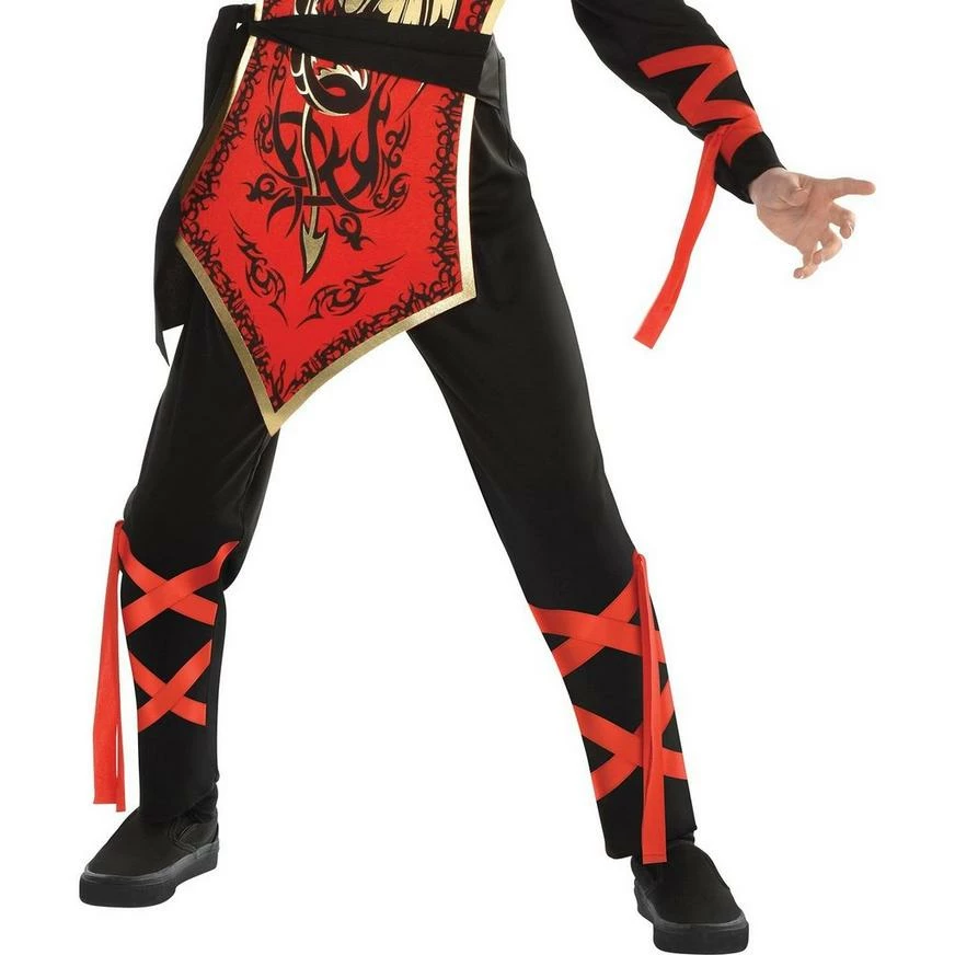 More on Boys Ninja Assassin Costume: Your little one can run swiftly from house to house in a Ninja Assassin Costume for boys this Halloween! The ninja costume includes a black jumpsuit, a black mask, a black belt, and a red tabard with a black and gold dragon design to make your little one look like a highly trained ninja assassin. Dress your little one up as a ninja and they’ll be ready for an action-packed time this Halloween! Review the size chart for additional sizing information. Shoes and sword not included.