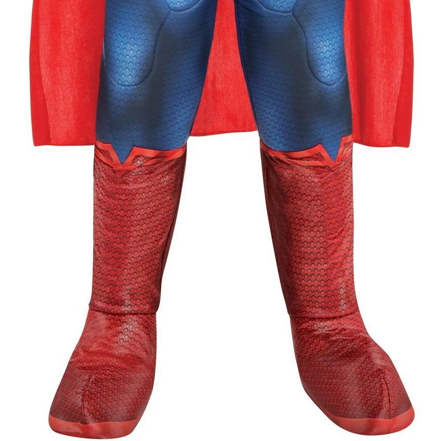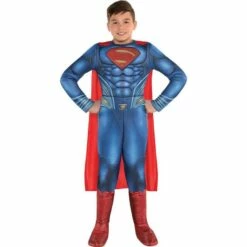 More on Justice League Part 1 Boys Superman Muscle Costume: He’ll be ready to join the Justice League in a Superman Muscle Costume for boys! This Justice League Part 1 costume features a blue printed jumpsuit with muscle designs, a Superman logo on the chest, and padding to make him look buff, plus attached boot covers for easy dressing and undressing. All he needs is his detachable red cape and he’s ready to fly in and save Halloween. Review the size chart for additional sizing information. Shoes not included.