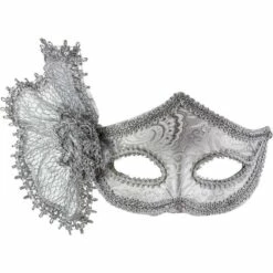 Be the belle of the masked ball with a gorgeous Brocade Parisian Masquerade Mask! This eye mask is covered in silver brocade and has silver trim around the edges and eye holes. Silver lace ruffles on one side make you one cute coquette.