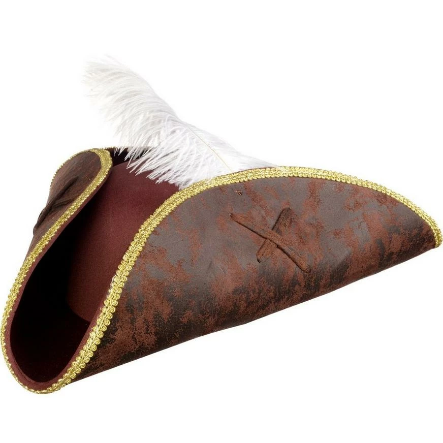No pirate costume is complete without this outfit topper. The brown tricorn pirate hat features an authentic three-cornered design with a worn and distressed look. Its gold trim and white feather accent give it a realistic pirate look that’s fit for the seven seas.