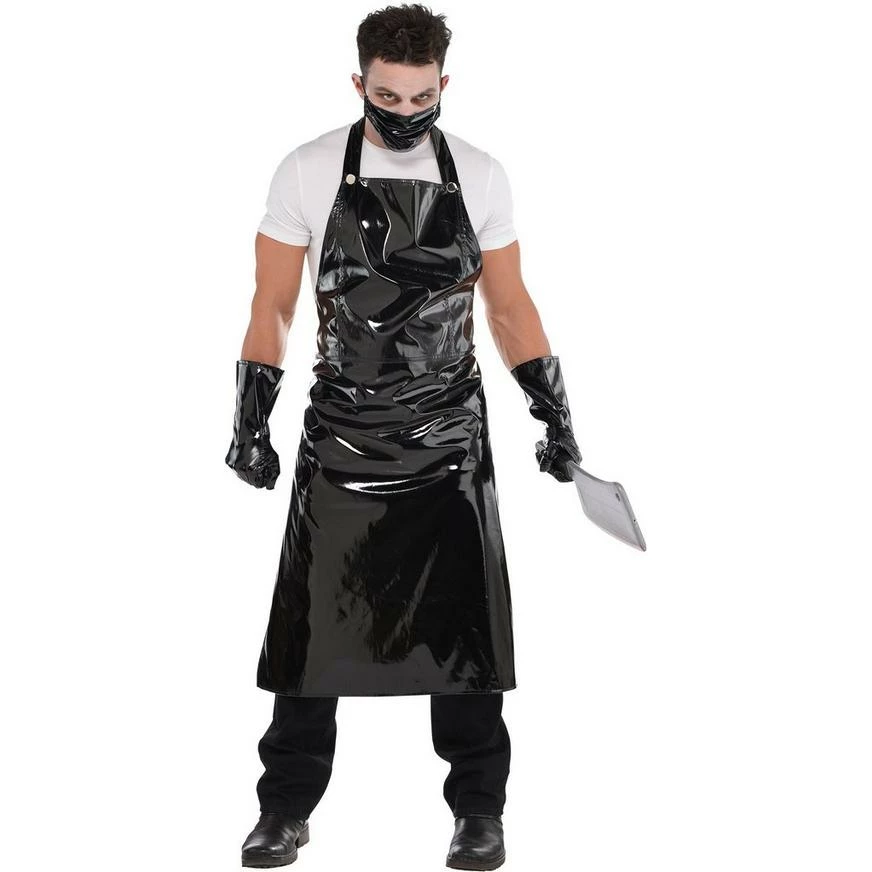 More on Butcher Costume Accessory Kit: For a scary Halloween costume, our Butcher Costume Accessory Kit is a prime cut! Featuring a black faux patent leather apron, this men’s butcher costume set also includes a matching black mask to cover your mouth and a black gloves to keep the blood off your hands. Prop not included. One size fits up to men’s size 42.