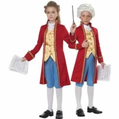 Your child becomes the wunderkind composer-performer himself with this 18th century-style polyester costume. The red jacket features gold crown-lace trim, French cuffs, and a standing collar. It comes with a satiny gold value-up vest attached. The costume also includes blue knickers-style pants and a white lace cravat necktie. It’s an ensemble like Mozart wore, maybe even when he conducted a classical ensemble. Wolfgang Amadeus was a musical genius whose music is still enjoyed by countless people across the world. Dressing like Mozart can inspire your child and their peers.