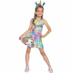 More on Poopsie Slime Surprise Unicorn Child Rainbow Brightstar Costume: Little ones will step into a magically vibrant world dressed up in this Rainbow Brightstar Costume! The polyester dress is covered in a hazy rainbow pattern and star designs. The headline “Dream In Color” is printed across the top in a glittery finish and Rainbow Brightstar herself is featured at the bottom hem. Top the costume off with the included unicorn horn headband to give them that iconic rainbow fringe. Review the size chart for additional information. Shoes not included.