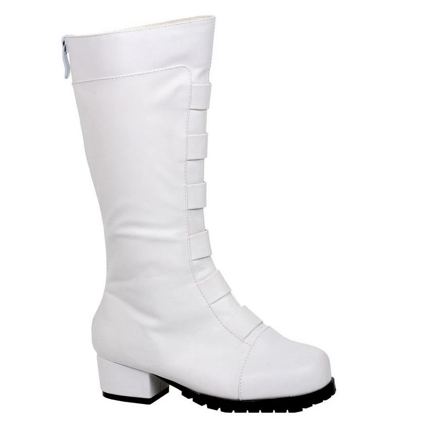 These Superhero White Knee High Boots are the last things bad guys will see! Suitable for boys and girls, these white combat boots with chunky heel are built extra tall and feature faux straps on the front. A back zip makes them easy to wear when it’s time to go from undercover to superhero!