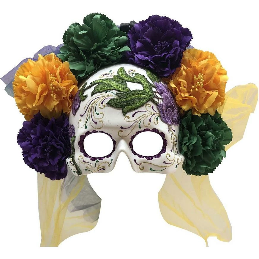 Wear this veiled Catrina mask for Halloween, Day of the Dead, and carnival! The mask is white plastic with green and purple fabric floral accents and green, gold, and purple glitter designs. The look is complete with a headband of matching flowers and an attached veil.