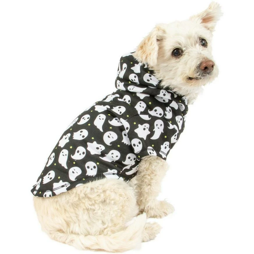 Keep your dog cozy and stylish while out trick-or-treating this year! This black dog hoodie is decorated with a pattern of cute and funny white ghosts.