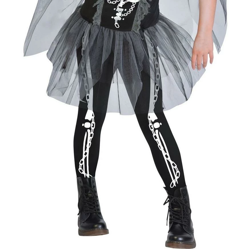 More on Girls Grim Reaper Costume: Everyone at the classroom costume party will be spooked when your little one shows up in a Grim Reaper Costume for girls! Pair the black skeleton-print tutu dress with the matching skeleton-print leggings. Complete the look with the gray mesh cape and, for extra eeriness, you can do your little one’s makeup to make her look pale and ghoulish. Death is creeping around every corner when you dress your little one up as the Grim Reaper! Review the size chart for additional sizing information. Shoes not included.