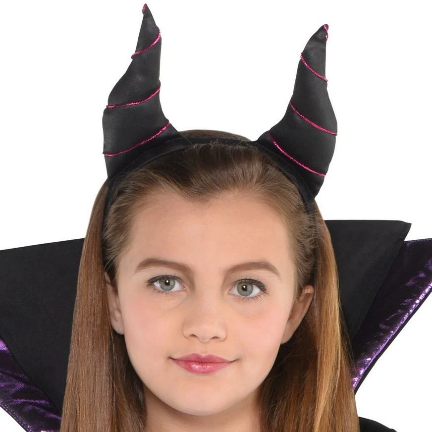 More on Sleeping Beauty Girls Maleficent Costume: This Maleficent Costume for girls is marvelously malevolent. Inspired by her look in Sleeping Beauty, this black velour dress features purple sequins down the front panel and an attached stand-up collar. The long sleeves have attached shimmering purple fabric that looks like a cape when she raises her arms. The back of this Disney Villain costume dress secures easily with a hook-and-loop closure. Finish the look with the stuffed Maleficent horns on a headband. Shoes not included.