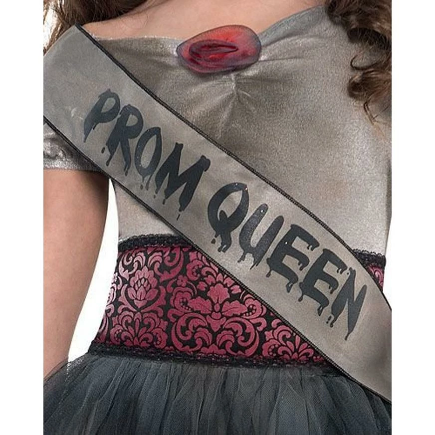 She’s just dying to be your date for prom! Our Prom Corpse Costume for girls features a gray gown with red rose appliques at the neckline and sleeves, a tattered tulle skirt with uneven hems and a removable red brocade print belt. A corsage of red roses and matching gray tulle goes on the wrist, and a tiara and sash crown you the prom queen from hell!