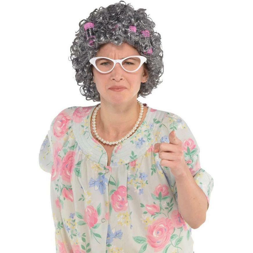 Turn into an old geezer with a Grandma Costume Accessory Kit! This accessory kit includes a gray synthetic fiber wig with attached pink curlers, white cat-eye frame glasses, and a faux pearl necklace. Put in dentures to enjoy all the candy received while trick-or-treating in this grandma costume! Dress not included.