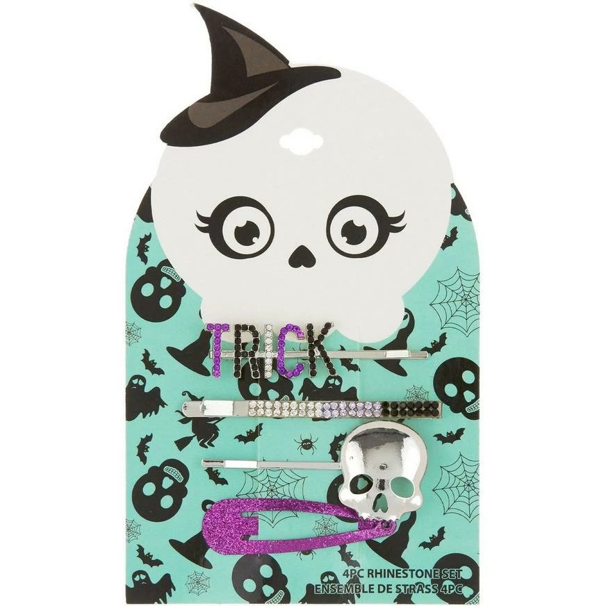 Get Halloween hair with this bobby pin and hair clip set! The set includes three bobby pins: one with “Trick” in black and purple rhinestones, one with just white and black rhinestones, and one with a silver skull. Also included is a purple glitter hair clip.