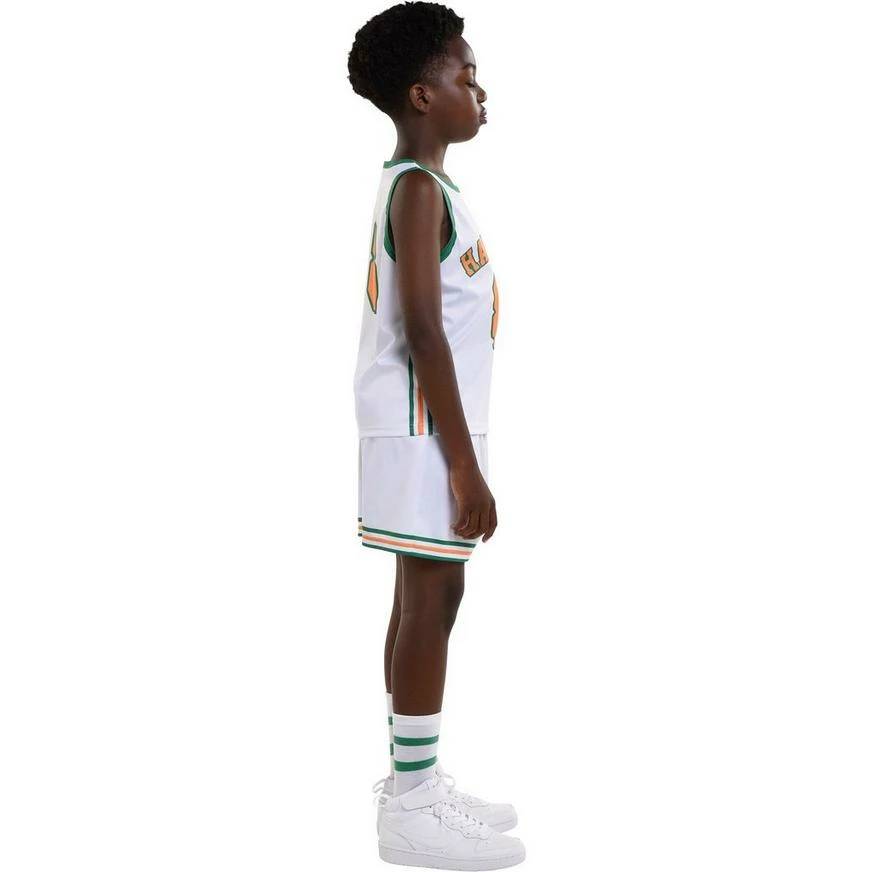 Shoot hoops with the team before playing Dungeons & Dragons as Lucas from Stranger Things! This kids’ costume is based on Lucas’s Hawkins High School basketball uniform. It features a white top and shorts with green and orange trim and “Hawkins 8” on the front and back of the jersey. It also includes white basketball-style socks with green stripes.