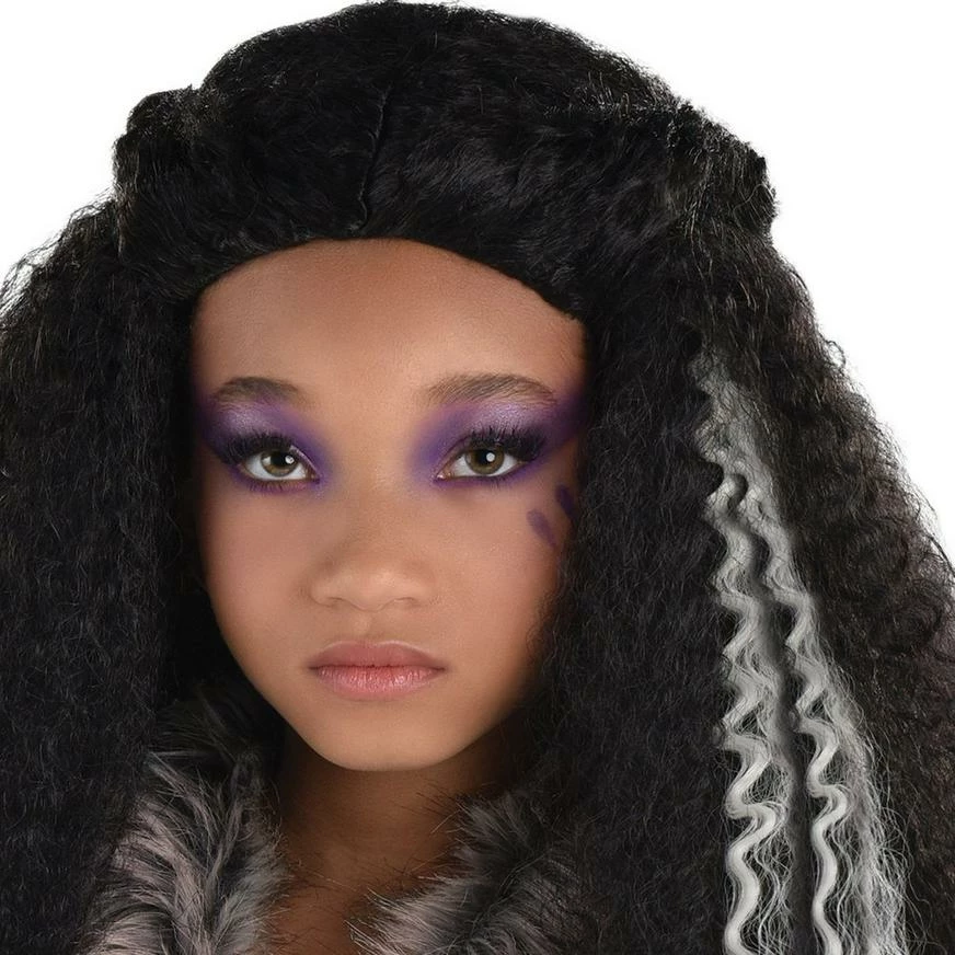 Help them get Willa’s complete look with this synthetic wig. It features dark brown, voluminous curls that are parted down the middle and a single white streak on one side. The front pieces are twisted and pulled back to create a crown effect.