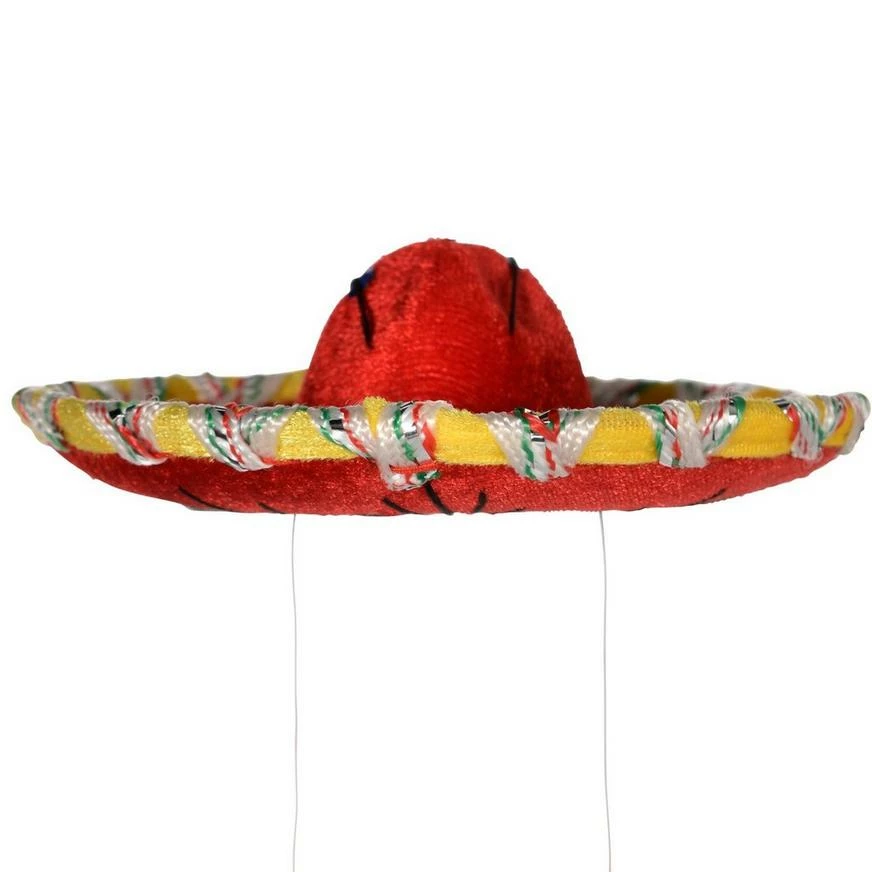 Tip your hat to your amigos and amigas wearing this adorable Mini Red Sombrero! This mini sombrero features a yellow rim with green, red, silver, and white stitching. The surface of the red hat has black stitching with blue, gold, and purple sequins on it. Complete with an elastic band attachment for a snug fit, this mini sombrero is the perfect accessory for your Cinco de Mayo fiesta!