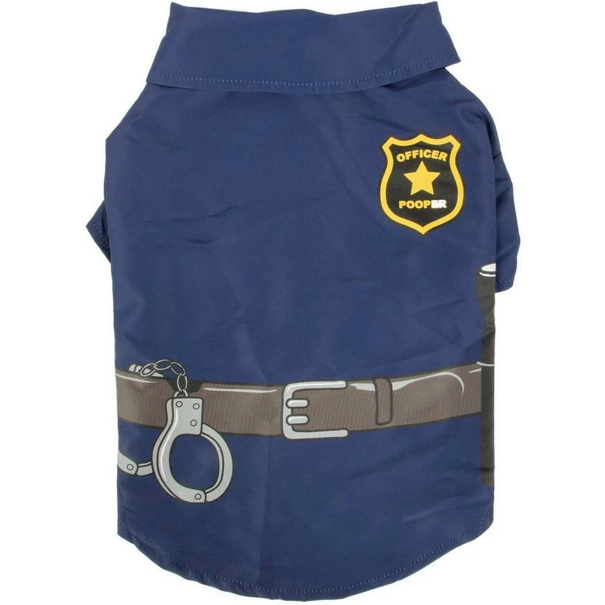 This puppy police officer is here to maintain paw and order! Dress up your pup in this blue police officer dog costume with faux belt, handcuffs, flashlight, and sheriff’s badge that reads “Officer Pooper!”