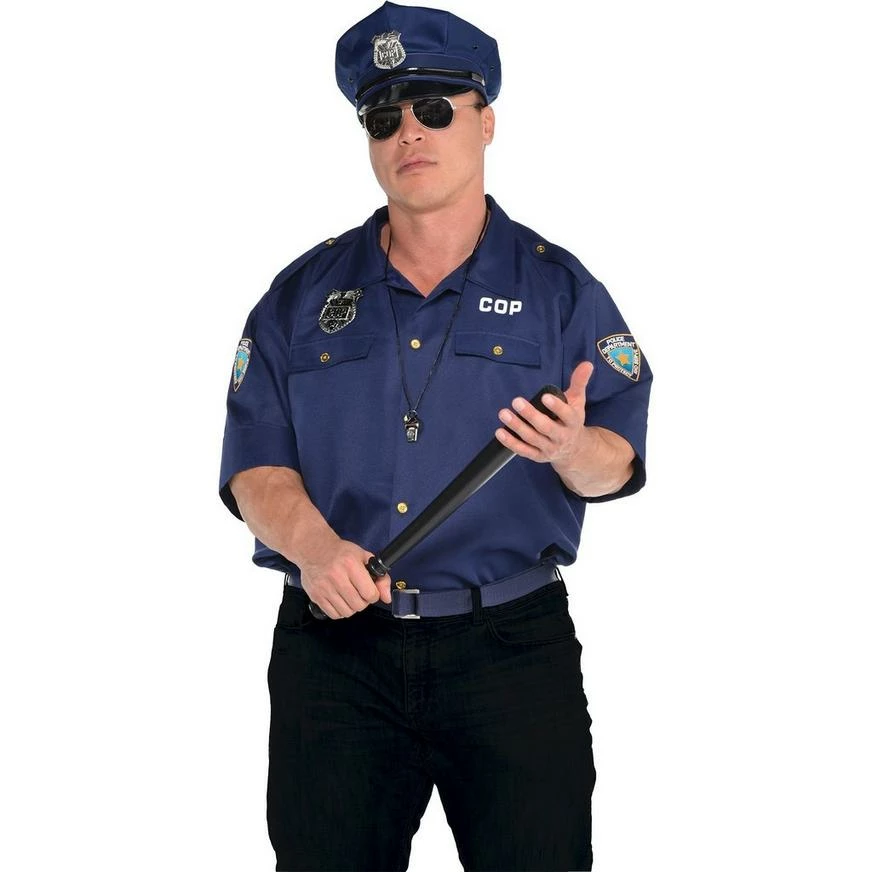 Join the boys in blue to serve and protect! This classic Police Shirt is a short-sleeved, collared shirt with a value-front design. Like authentic cop shirts, it features faux pockets on the front and official-looking embroidered law enforcement patches on both shoulders. Wear this blue cop shirt as part of your police costume.