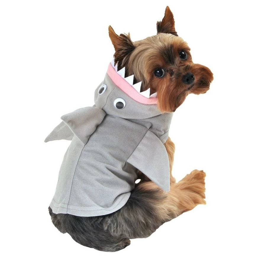 There’s something in the water! Oh, it’s just your pup in our Shark Dog Costume. This dog shark costume features plastic googly eyes on the hoodie, which is trimmed with white felt fangs. It’s finished with three plush fins on the top and sides. Our shark costume for dogs has a hook-and-loop closure under the belly.