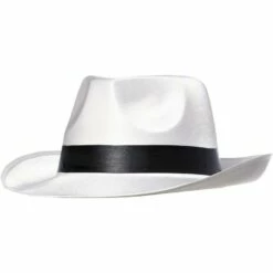Get a White Gangster Hat and soon you’re a made man! This mobster fedora hat is made of white molded fabric with deep indentations in the crown and a stylish brim upturned in the back. A black satin hatband provides a striking accent. It’s great for ’20s gangsters and Sinatra impersonators alike!